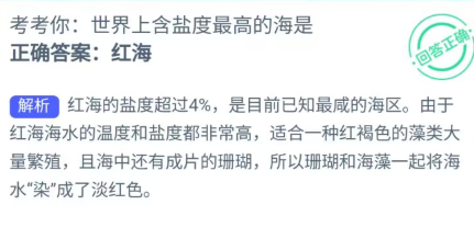 世界上含鹽度最高的海是,神奇海洋是支付寶螞蟻森林中推出的新玩法,除了收集能量種植外,還可以通過答題等一系列玩法來獲取免費的海洋碎片,集齊碎片就可以合成啦,喜歡的小伙伴趕快來看看神奇海洋4月15日答案最新吧。