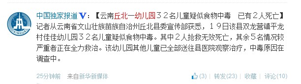云南丘北縣雙龍營鎮佳佳幼兒園32名兒童疑似食物中毒已2人死亡(圖片:新華社中國獨家報道微博截圖)