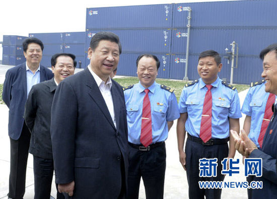 習近平十分關心商貿物流業和企業科技創新發展。10日上午,他在鄭州先后考察了鄭州市跨境貿易電子商務服務試點項目、鄭州國際陸港、中鐵工程裝備集團有限公司,看展板,聽介紹,進車間,詳細詢問有關情況。了解到鄭州市跨境貿易電子商務服務試點項目運營不到1年,就取得直通世界13個城市、貿易進出口貨值130多億元、為100余家商戶提供實貨測試服務的成績,習近平同窗口工作人員一一握手,詳細察看貨物配貨、包裝、過關查驗流程,勉勵他們朝著“買全球賣全球”的目標邁進??吹洁嵵輫H陸港集鐵路港、公路港、空港、海港于一體,正在打造國家鐵路一類口岸、多式聯運服務中心、中歐班列貨運中心、智慧物流信息中心,習近平希望他們建成連通境內外、輻射東中西的物流通道樞紐,為絲綢之路經濟帶建設多作貢獻。他來到鄭歐國際貨運班列前,同機組人員交談并合影留念。