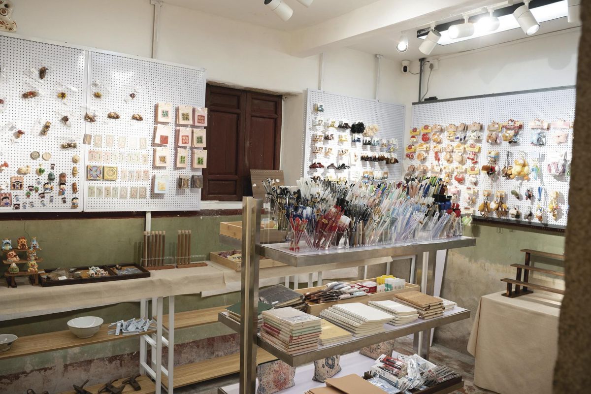 走進文創館,質樸溫暖的氣質撲面而來。一磚一瓦、一木一石在創意點化下重獲新生。吳志鑫介紹,團隊秉承“低成本高視覺沖擊”理念,將藝術靈感與廢棄材料巧妙融合:收銀臺采用閩南“出磚入石”技藝,以舊磚、窗花、卵石和回收木材壘砌而成;店面招牌選用一塊被白蟻啃噬的松木,其獨特紋理成為詮釋“殘缺美學”的獨特標識;舊櫥柜搭配扎染花布與老柜門,便化身韻味十足的展臺。