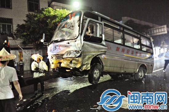 昨晚7點多,海都記者第一時間趕到現場。事發路段是雙向6車道,路中央有5截護欄被撞沒。泉州往安溪方向的車道上,一輛閩CT33××的出租車,橫在路中,車的右側部位和車頭嚴重變形。一輛閩CY38×ד泉州—安溪”的中巴車,車頭對著出租車,前窗玻璃開裂嚴重,車頭下盤和駕駛室被撞凹。