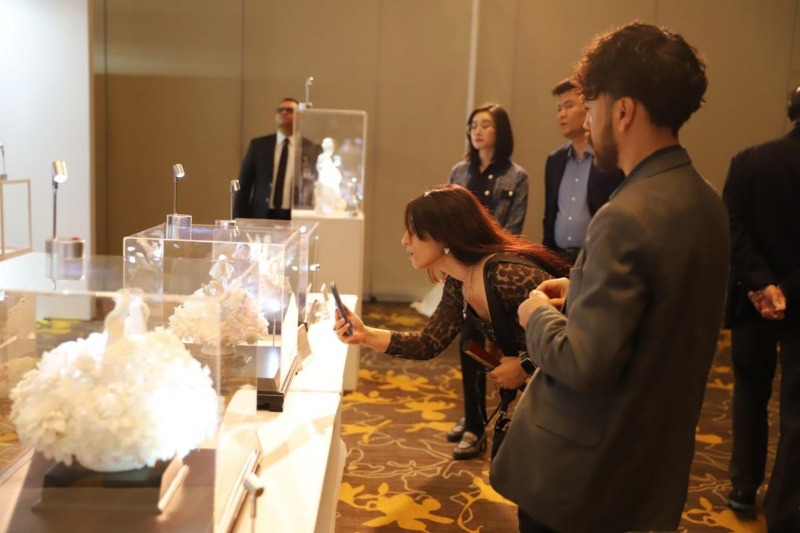 2025年11月21日,2025 “中國白·德化瓷”國際巡展美國洛杉磯展覽暨推介會在美國加州洛杉磯舉行。圖為出席展覽的觀眾在用手機拍照。新華社發(fā)(邱晨攝)