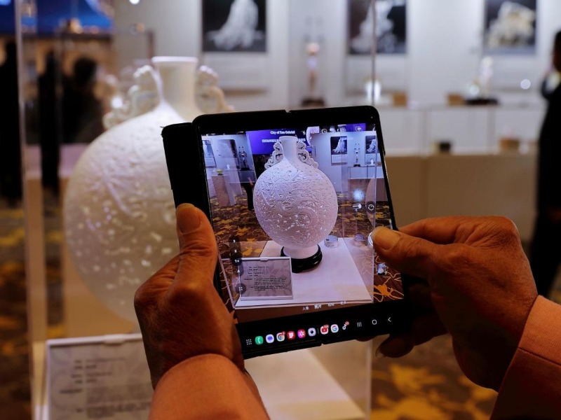 2025年11月21日,2025“中國白·德化瓷”國際巡展美國洛杉磯展覽暨推介會在美國加州洛杉磯舉行。圖為出席展覽的觀眾在用手機拍照。新華社發(fā)(邱晨攝)
